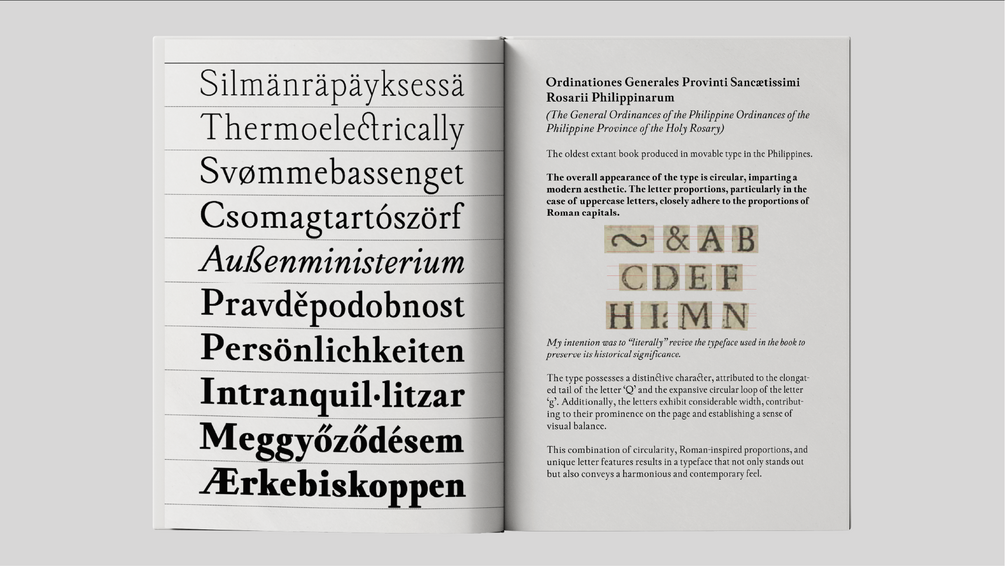 Ioannem is a typeface based on the 1604 book Ordinationes Generales Prouintiæ Sanctissimi Rosarij Philippinarum, printed by Juan de Vera—the oldest extant book produced with movable type in the Philippines. The typeface is wide and rounded, featuring wedge serifs that evoke an authentic historical feel. I meticulously studied a scanned copy of Ordinationes Generales, focusing on the letter proportions and details, and recreated the typeface to capture the essence of the original while making it suitable for modern use. Ioannem is available in multiple weights and supports multiple languages.
